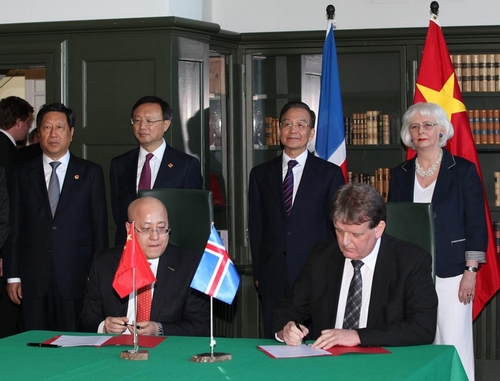 雷克雅未克當(dāng)?shù)貢r(shí)間4月20日下午,中國藍(lán)星公司和冰島政府關(guān)于“太陽能多晶硅及金屬硅項(xiàng)目合作”意向書簽署儀式在冰島首都雷克雅未克國家文化宮舉行。中國總理溫家寶與冰島總理西于爾扎多蒂共同出席現(xiàn)場(chǎng)并見證了雙方的簽字儀式。