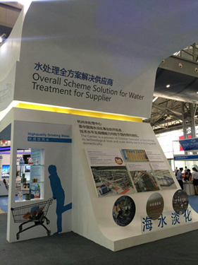 在“環(huán)境與服務(wù)”板塊,借助巨幅鳥巢夜景照片展板介紹了藍(lán)星水處理膜法回用技術(shù),使體育館污水處理再生利用率達(dá)100%,解決了鳥巢70%用水的水處理服務(wù)業(yè)務(wù),展現(xiàn)了藍(lán)星水處理在廢水治理及再利用領(lǐng)域的領(lǐng)先技術(shù)。藍(lán)星杭州水處理中心的海水淡化業(yè)務(wù)及高端純水技術(shù)和設(shè)備,在當(dāng)下的用水安全和水資源短缺的背景下,格外受關(guān)注。其中先進(jìn)的高端純水技術(shù)展陳方式是用一輛超市購(gòu)物車照片展板,搭配擺放青島啤酒、農(nóng)夫山泉、娃哈哈等飲料實(shí)物,許多參觀者都驚嘆他們?nèi)粘o嬘玫娘嬈吩瓉?lái)是經(jīng)過(guò)了藍(lán)星優(yōu)質(zhì)純水技術(shù)和設(shè)備的處理,賺足了參觀人氣。除了高品質(zhì)飲用水,杭州水處理中心的純水技術(shù)和設(shè)備還能“制造”醫(yī)藥用水和電子用水。