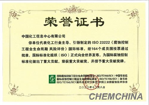 自2018年初開始,信息中心與中國工業(yè)防腐蝕技術(shù)協(xié)會合作,以信息中心為代表主導(dǎo)、引領(lǐng)制定ISO 23222《腐蝕控制工程全生命周期 風(fēng)險評價》國際標(biāo)準(zhǔn)。經(jīng)過3年的辛勤付出,該標(biāo)準(zhǔn)于2020年11月3日,經(jīng)164個成員國投票通過批準(zhǔn),由國際標(biāo)準(zhǔn)化組織(ISO)正式向全世界發(fā)布。中國化工集團(tuán)代表化工行業(yè)主導(dǎo)、引領(lǐng)了腐蝕控制全生命周期領(lǐng)域又一具有里程碑式的重大事件。