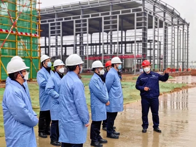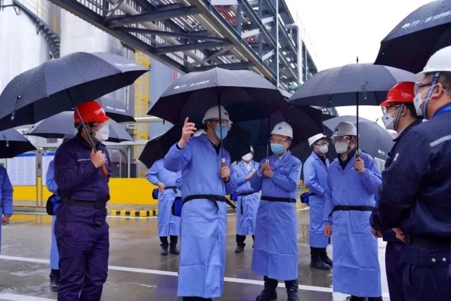 ▲在項(xiàng)目建設(shè)現(xiàn)場,了解新建電解液項(xiàng)目新工藝和總體進(jìn)度