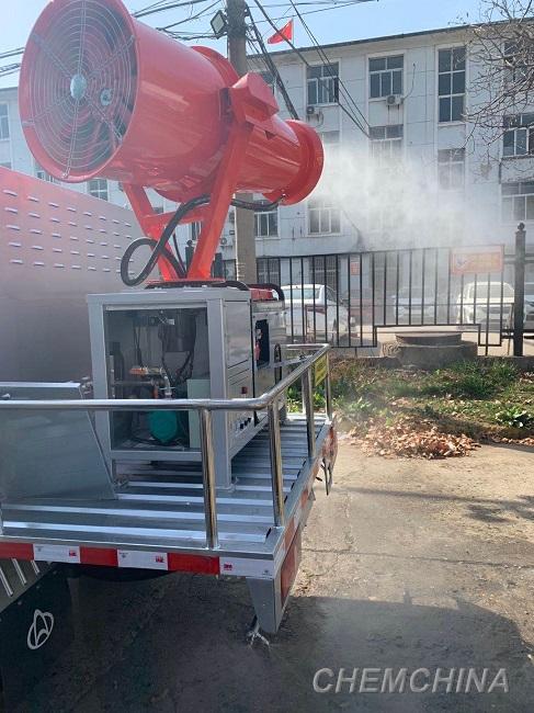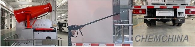 噴灑功能方面,車輛配置了水霧炮、手持噴灑槍及道路噴淋三種裝置。其中,水霧炮既可用于對公共場所空氣環(huán)境進行清潔消毒,平時也可用于凈化周邊空氣質(zhì)量,如對施工場地或廣場道路進行噴灑降塵,其噴灑作業(yè)面積可達5萬平米。手持噴灑槍可用于對移動設施或作業(yè)空間受限的物表面進行噴灑消毒,也可用于高壓清潔或日常環(huán)境綠化澆灌,持續(xù)作業(yè)時長約40分鐘。道路噴淋裝置可對寬幅3米的道路地面進行清潔或消毒作業(yè),一次作業(yè)長度達5000km。